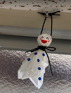 てるてる坊主 is a paper doll. Japanese people make these paper dolls and hang them on a window or a door.