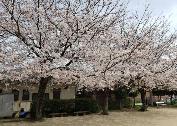 First, there are the cherry trees at Ohara Junior High School nearby. Some of them are quite large, and when they are in full bloom, they transform the surrounding atmosphere into a scene filled with spring.